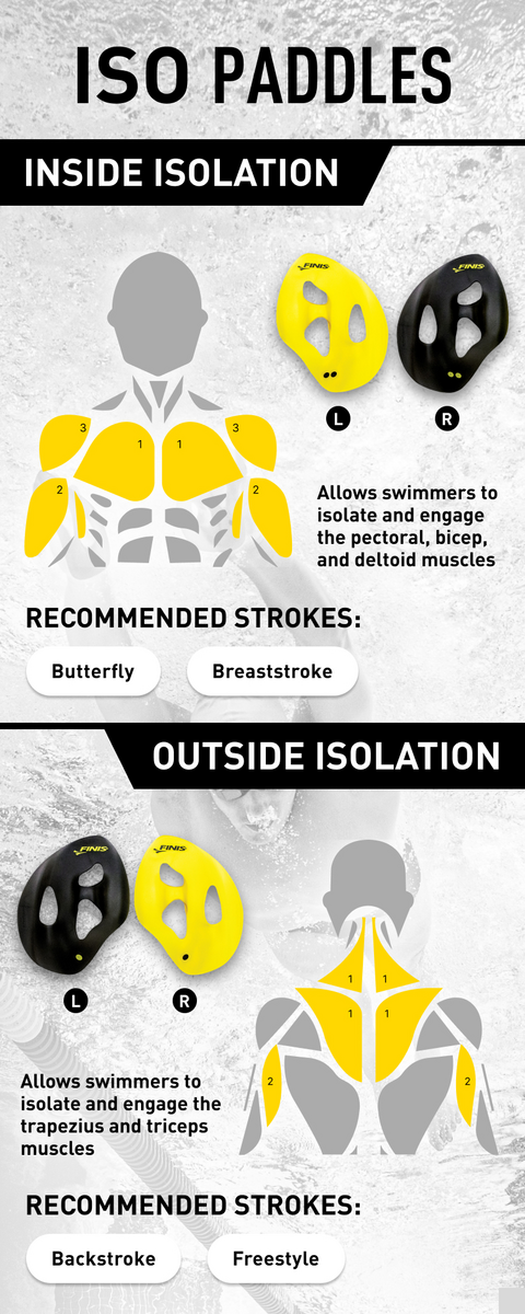 Iso paddles are strapless paddles designed to isolate specific muscle groups, develop proper hand position and heighten stroke awareness. Iso paddles are uniquely designed to create an imbalance in the catch phase of a stroke, which forces swimmers to apply more pressure on either side of the paddle in order to maintain a proper stroke. The variance encourages swimmers to pay increased attention to hand position in the water, keeping it level and consistent throughout the catch and pull of each stroke.